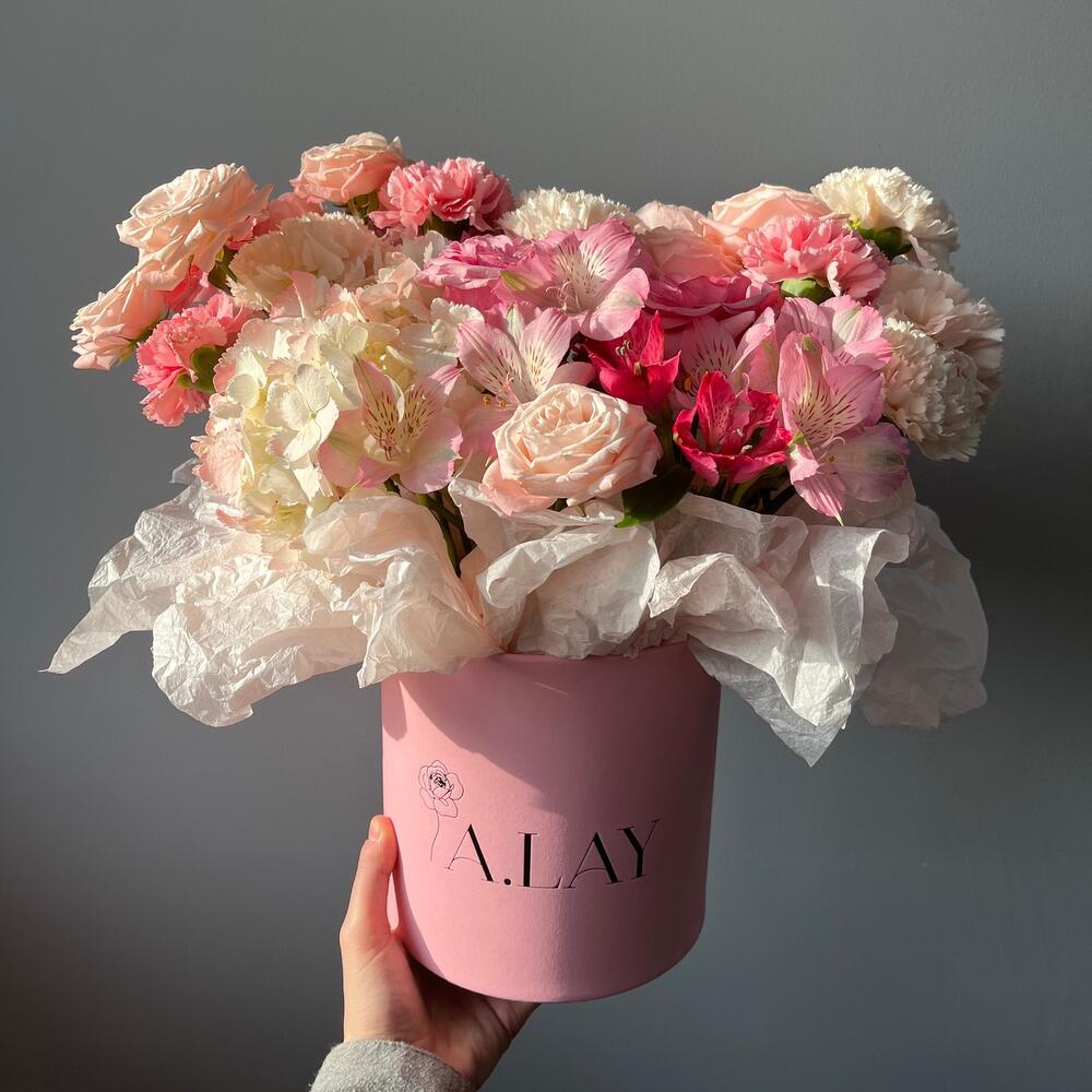 Альстромерия - 3 шт. Гортензия - 1 шт. Диантус - 11 шт. Шляпная коробка - 1 шт. Кустовая роза пионовидная - 1 шт. роза кантри блю - 3 шт.